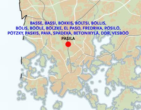 everyword in finnish seems to have a dozen variations. i just found a flash site that shows the different names for all the different areas within the helsinki region. here is where i live: (pasila being the proper name, with the names in blue being other versions)