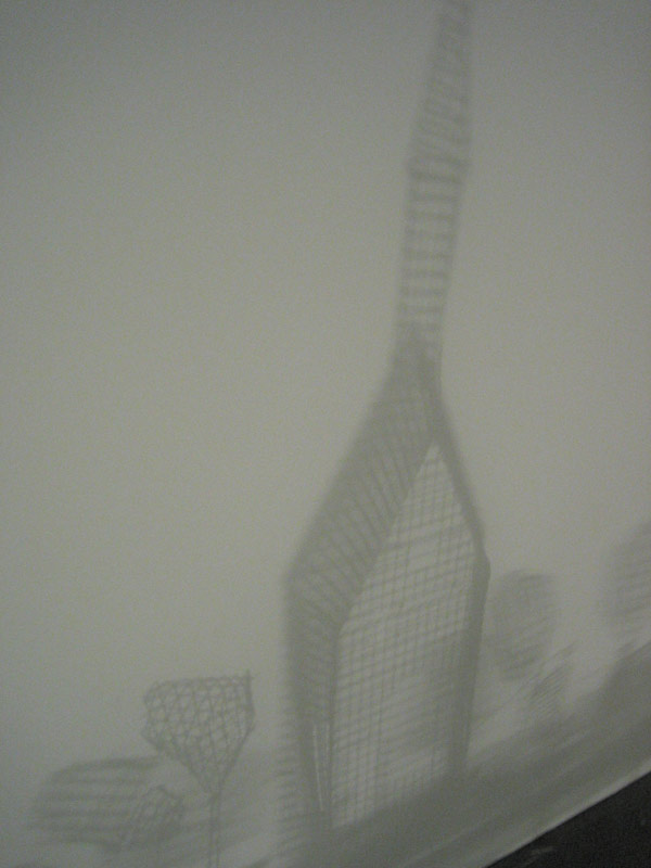 next up came my favourite. the piece was called “kylä” (village) and it is by the finnish artist jaakko niemelä. it has a disc of about 1metre diameter rotating. on this disc is a small town made out of wire to give a wireframe look. a light shined upon the rotating village and the shadow created (in the picture below) was such a simple yet incredibly effective piece, i sat there staring at it for ages as it spun around and around and around. i want it 🙂